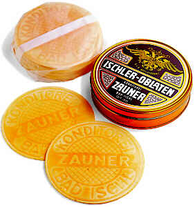 ...laut Duden ist die Oblate eine ungeweihte Hostie; dünnes, rundes Gebäck; Unterlage für Konfekt, Lebkuchen. Es gibt die Oblate in unterschiedlichster Formen und Geschmacksrichtungen. Bei Oblaten denkt der "Otto-Normalverbraucher" zuerst an die üblichen Backoblaten die aus der Weihnachtsbäckerei bekannt sind. Diese gibt es in kleiner , großer, rechteckiger Ausführung, sind immer einfach und in der Farbe "Weiß" und haben keine Füllungen. Speziell für das Backen sind diese Oblaten hervorragend zu verwenden und zu empfehlen. Natürlich kann man diese Oblaten auch herrlich als "Naschwerk" verwenden. |